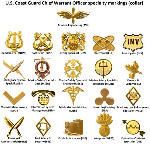 Chief Warrant Officers (CWO) are highly specialized technical experts and leaders, typically selected from senior enlisted ranks (Chief Petty Officers) to fill roles requiring in-depth expertise in fields like personnel administration, engineering, marine inspection, aviation, and finance & supply. They are mid-level commissioned officers acting as senior advisors to superiors and mentors to junior personnel. Due to the relatively small size of the Coast Guard and its unique orginizational structure, CWOs often hold command positions at Stations and aboard smaller cutters.