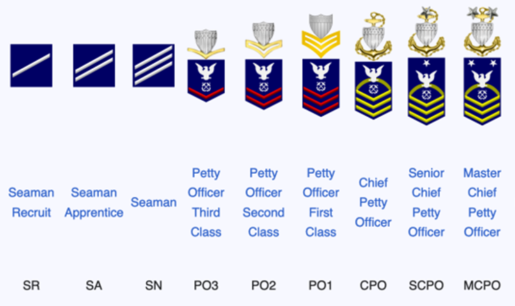 E-1 thru E-3 are junior personnel; E-4 thru E-6 are Petty Officers; E-7 thru E-9 are Chief Petty Officers.